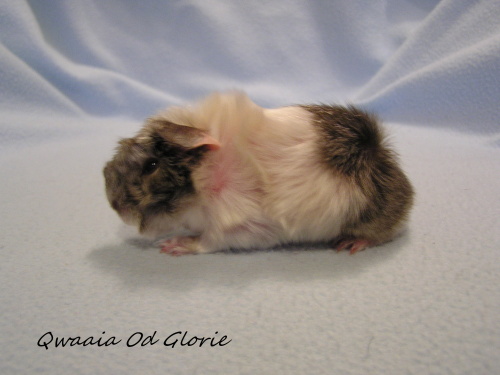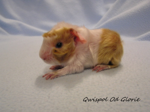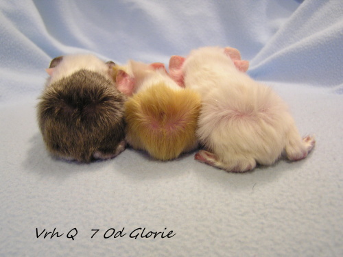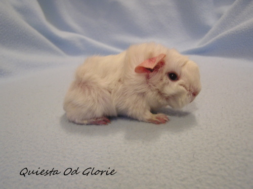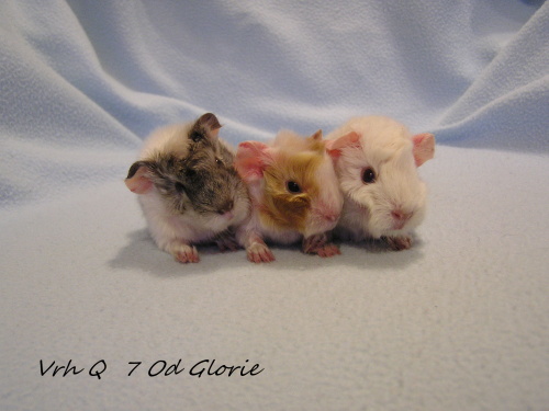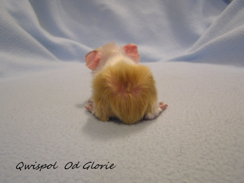 ) porodila 19.10.2015 4 miminka, jedna samička bílá saténová PV 103g byla mrtvá. Tatínkem je Jethro z Boleradic (peruánec, satén, bílý tmavooký).